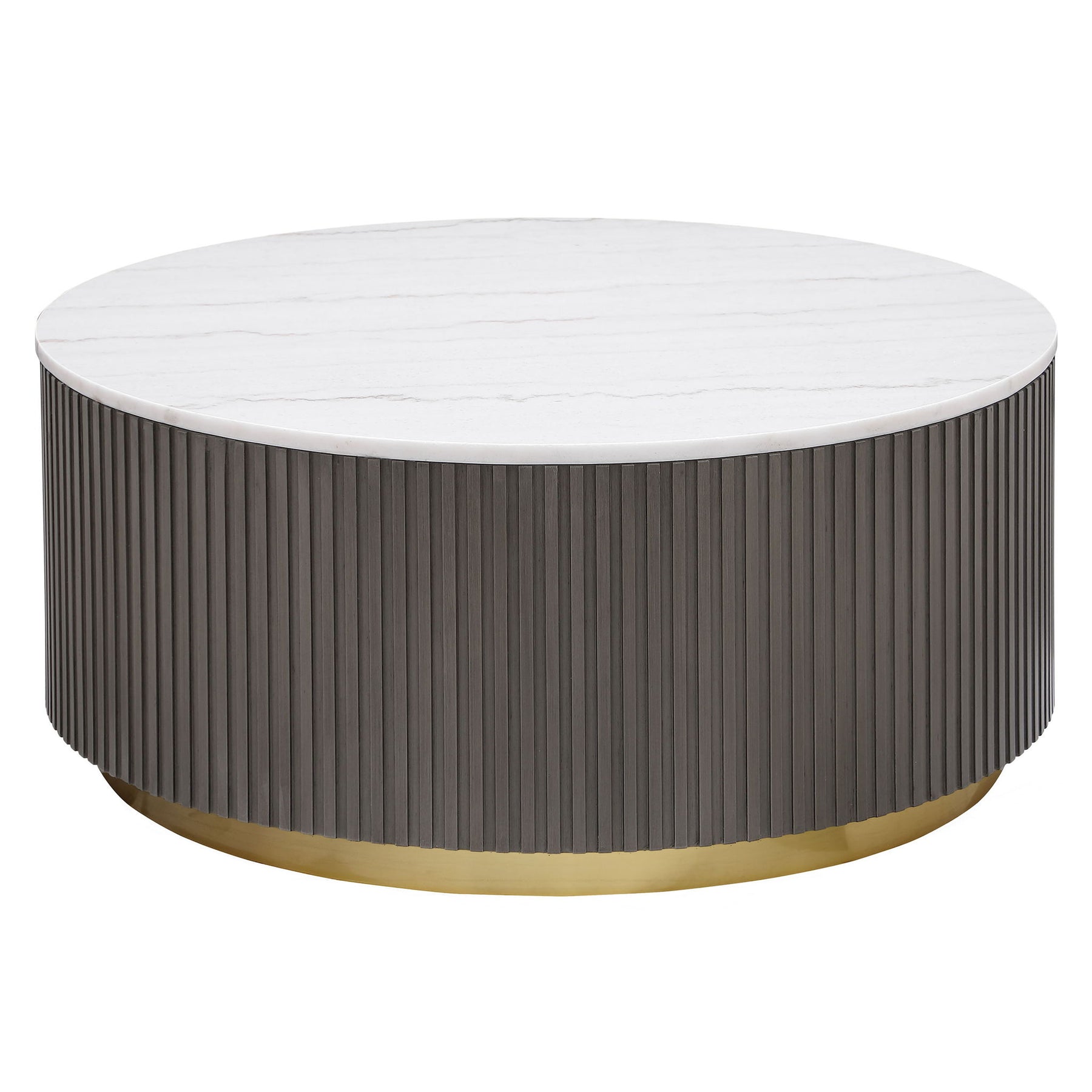 Center your living space with this elegant, modern round table. The genuine marble top exudes sophistication with its subtle veining, adding organic flair. The clean, light coloration complements any surrounding decor. A ribbed, engineered wood frame in a charcoal finish creates texture and depth, while the brushed gold metal base brings a luxurious touch. This piece seamlessly blends refined materials and design, making it the perfect addition to your living room.