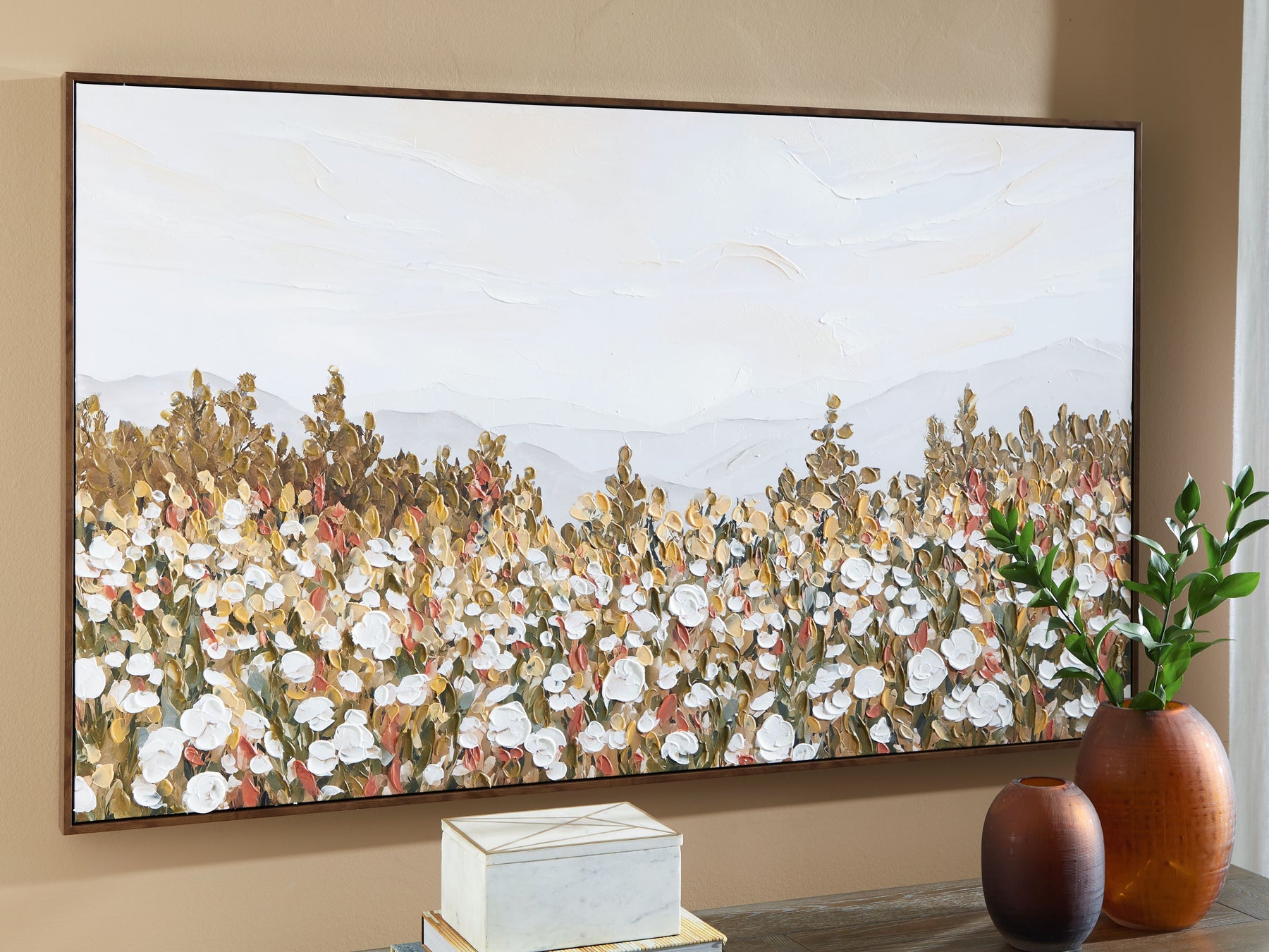 This wall art offers a beautiful contrast between a field of white flowers and the wide-open sky. A serene interpretation of the beauty of nature, its muted tones pair well with a variety of color palettes. Hand-painted embellishments complete the piece.